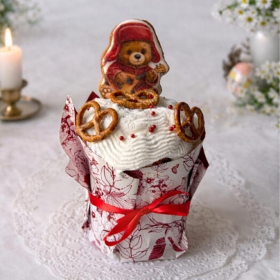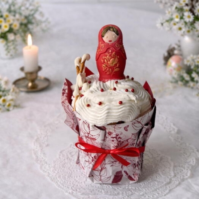 Сверху покрыт глазурью и украшен пряником в виде кокошника — аккуратно и по-праздничному.