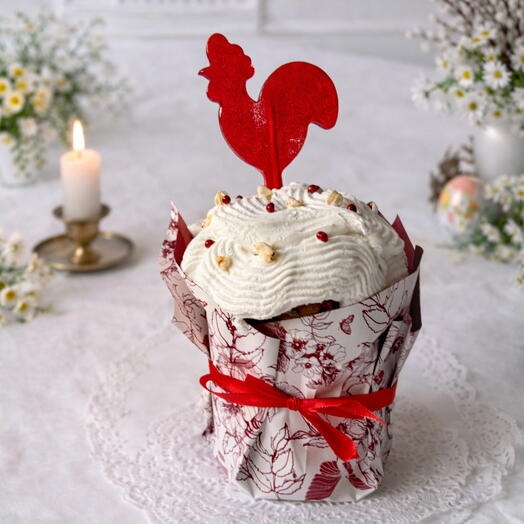 Сверху покрыт глазурью и украшен леденцом-петушком — аккуратно и по-праздничному.