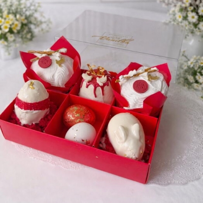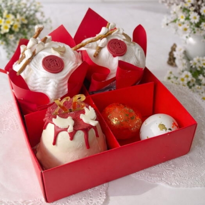 Внутри — клюква вяленая, вишня вяленая, клубника вяленая, кумкват, изюм, кешью, грецкий орех, фундук, которые добавляют лёгкую кислинку и глубину вкуса.