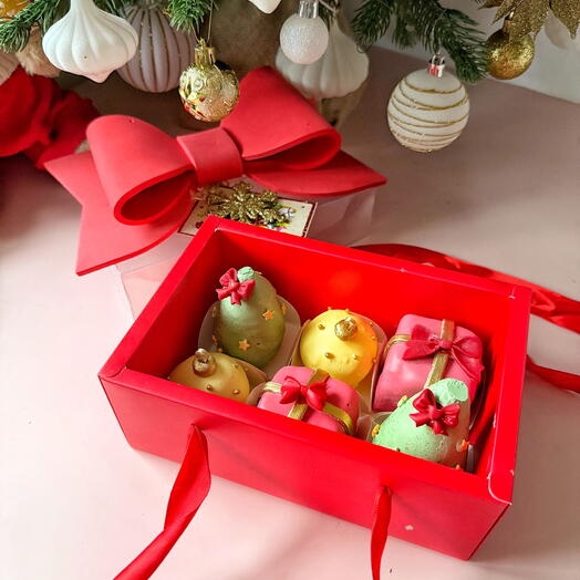 В подарочной упаковке, украшенной большим праздничным бантом, лежат кейкпопсы, сделанные как маленькие символы Нового года: ёлочка, подарок и ёлочный шарик.