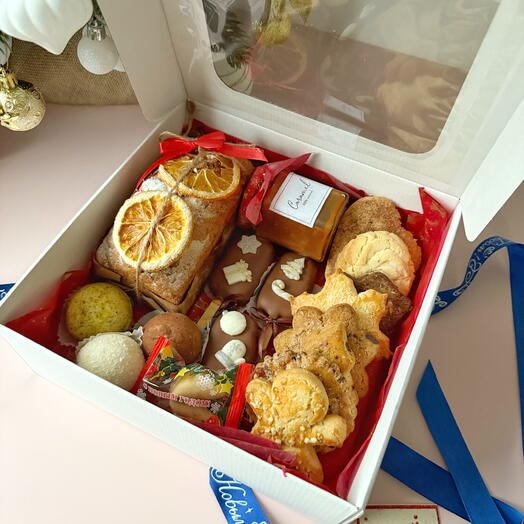 В подарочной коробке с прозрачным окном — маленькая коллекция новогодних лакомств, которые хочется пробовать медленно, с горячим чаем и разговором без спешки.