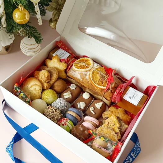 В красивой коробке с прозрачным окном — целая сладкая коллекция, аккуратно перевязанная лентой и украшенная ёлочной игрушкой, которую можно сразу повесить на ёлку — небольшой жест, но очень уютный.